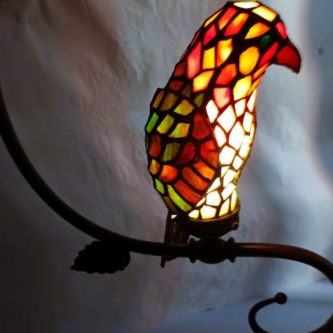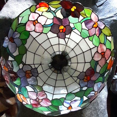 Vi har en kæmpestor mosaik glas loftlampe, som er skabt af robuste stykker farvede glas i Tiffany stilen. Lampen hængt bare et par måneder og da vi flyttede til en anden bopæl, blev den bare opbevaret på løftet i en plastik. Den er næsten NY og fejler ikke noget. Der er 3 elpære E-27, som kan give en kraftig belysning. Lampen har diamenter på 48 cm og højde (uden kædens længde) er ca. 39cm. Den kan måske bruges til selskabslokale eller lignende... Eller nogen kan hænge den i sin stue. Motivet er forskellige blomster (lyslilla, mørklilla og lyserøde) Nogle grønne "blade" har perlemoragtig glans. Fast pris: 1000kr. Vi sender IKKE og modtager KUN kontanter.