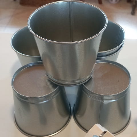 Sæt med firkantede metal potter til planter. Potterne har et råt, industrielt udseende med synlige metalteksturer. Egnet til indendørs brug til små planter eller stiklinger.