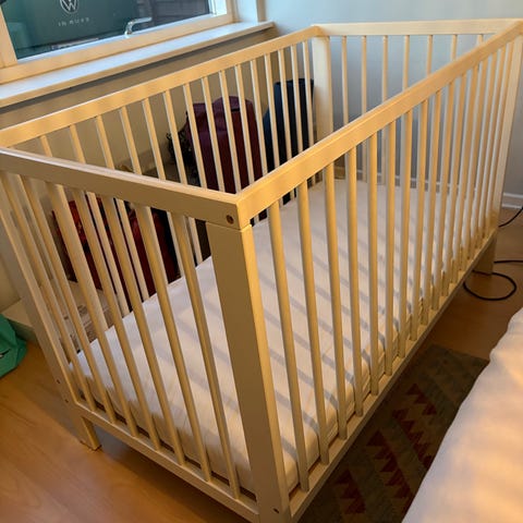 IKEA Gulliver Tremmeseng til børn i hvid farve. Sengen er fremstillet med tremmer og har en madras medfølger. Konstruktionen er lavet af træ med en robust ramme og lamelbunde. Sengen er designet til børn og giver en sikker og komfortabel soveplads.