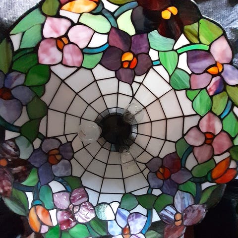 Vi har en kæmpestor mosaik glas loftlampe, som er skabt af robuste stykker farvede glas i Tiffany stilen. Lampen hængt bare et par måneder og da vi flyttede til en anden bopæl, blev den bare opbevaret på løftet i en plastik. Den er næsten NY og fejler ikke noget. Der er 3 elpære E-27, som kan give en kraftig belysning. Lampen har diamenter på 48 cm og højde (uden kædens længde) er ca. 39cm. Den kan måske bruges til selskabslokale eller lignende... Eller nogen kan hænge den i sin stue. Motivet er forskellige blomster (lyslilla, mørklilla og lyserøde) Nogle grønne "blade" har perlemoragtig glans. Fast pris: 1000kr. Vi sender IKKE og modtager KUN kontanter.