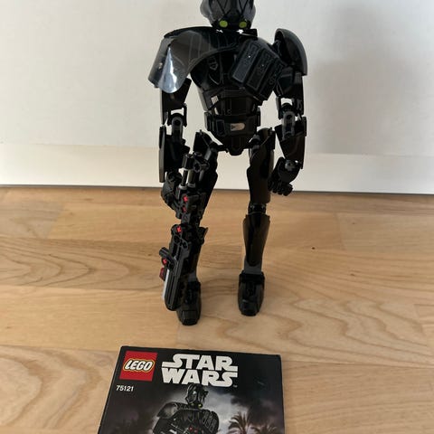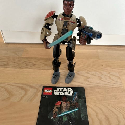 LEGO Star Wars Kylo Ren figur med sort kappe og rødt lyssværd. Figuren er detaljeret og inkluderer en instruktionsbog.