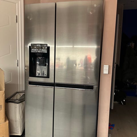 Samsung Side-by-Side køleskab med indbygget vand- og isdispenser. Køleskabet har separate sektioner til køl og frys med flere hylder og opbevaringsrum. Designet til opbevaring af madvarer med nem adgang og overskuelig indretning.