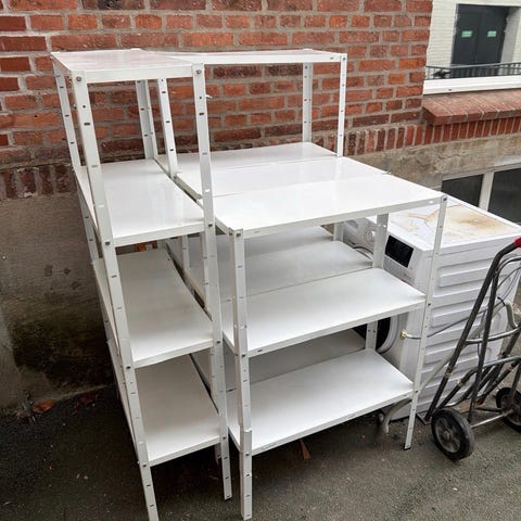 Metal reol med 5 hylder. Hylderne er opbevaret i tørvejr og derfor ikke lagt på pt.