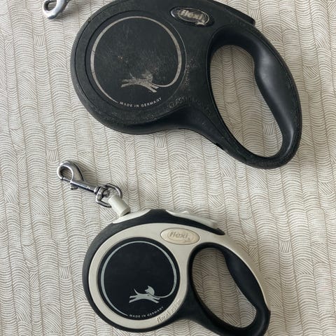 Flexi hundesnore i sort og grøn farve. Designet med ergonomisk håndtag og automatisk optræk. Velegnet til at give hunden bevægelsesfrihed med sikker kontrol. 5 meter. 50 kr pr stk. stort set ikke brugt. fra ikke ryger. OBS den med sort håndtag er solgt.