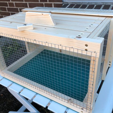 Træbur med nettag designet til udendørs brug. Buret har en rektangulær form og er konstrueret af trærammer med metalnet for ventilation og beskyttelse. Buret har en åbning på toppen med hængsler, som gør det nemt at få adgang til indersiden. Velegnet til smådyr eller som beskyttelse af planter.