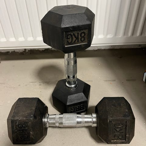 MM SPORTS Cast Iron Dumbbell Set med justerbare vægte og medfølgende opbevaringskasse. Sættet indeholder flere vægtskiver, to håndtag og låsemøtrikker til fastgørelse af vægtene. Fremstillet i støbejern.