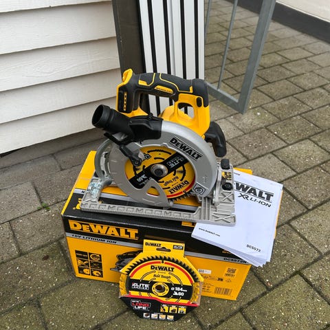 DeWalt DCS391 Akku rundsav til 18V batteri, 760W effekt, og en savklinge på 165 mm i diameter. Maskinen har en maksimal skæredybde på 55 mm og en tomgangshastighed på 5150 omdrejninger per minut.
