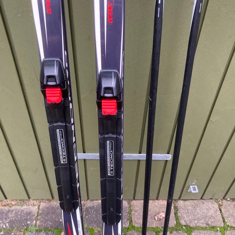 Langrendsski med støvler og stave til herre og dame. Dameskiene er med skin og så gode som nye.