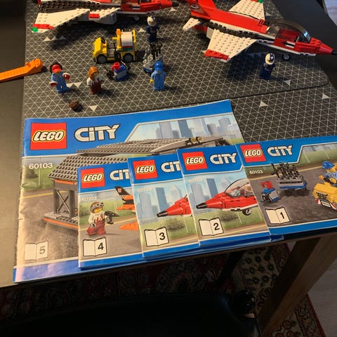 LEGO City flyvesæt med to røde fly, landingsbane og tilhørende figurer, egnet til børn i alderen 6-12 år.
