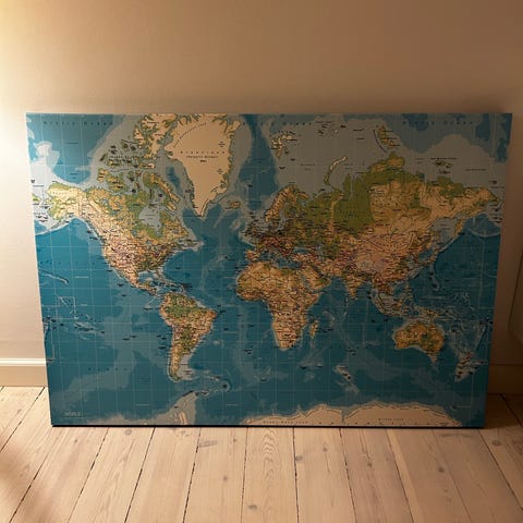 Stort, flot verdenskort inkl. ramme. Måler 200x140.