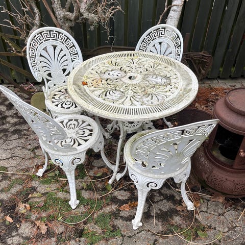 Nye hvid/gule hynder, specielt syet til havemøblerne. Samme have møbler findes på Chateau Cayx i Frankrig. (Se billede) Sættet er designet til udendørs brug og har et klassisk, dekorativt mønster i metallet.