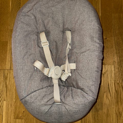 Stokke Nomi babyindsats med gråt betræk og sikkerhedsseler.
