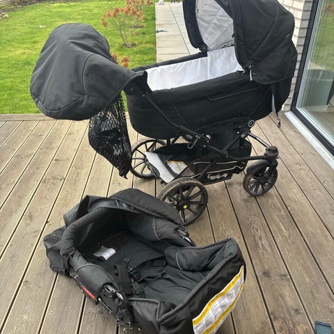 Emmaljunga barnevogn med aftageligt klapvognssæde og justerbar kaleche. Barnevognen er i grå farve og har polstret sæde og sikkerhedsbøjle. Hjulene er robuste og velegnede til forskelligt terræn. Designet til at give komfort og funktionalitet ved transport af børn.