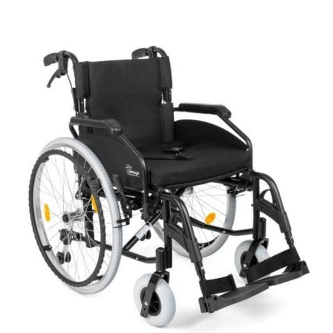 R82 Aktiv kørestol med sort polstring. Kørestolen har et stel i metal og er udstyret med aftagelige fodstøtter. Designet til aktiv brug med komfortabel sæde- og rygpolstring.