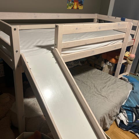 JLY Højseng til børn med integreret stige og rutsjebane. Fremstillet i træmateriale med hvid finish. Passer til børneværelser og giver mulighed for både soveplads og leg, da der er mulighed for at lave en hule under sengen. “Teltet”, der ses på billedet fra forhandleren, har et knækket plastikrør, men vi har brugt det alligevel og uden problemer. Der medfølger en madras, som der aldrig er sovet en fuld nat på.