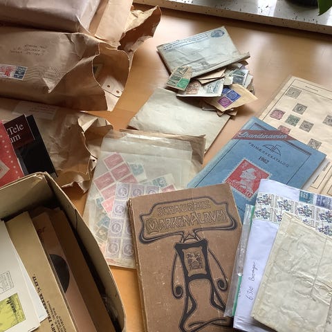 Frimærkealbum indeholdende en samling af blandede frimærker i forskellige farver og motiver. Albummet har sider med lommer til opbevaring og visning af frimærker.