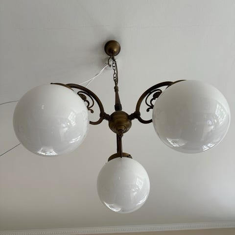 Smuk lysekrone købt på Ellos ny pris ca. 1300. Brugt i kort tid. OBS uplight - den lyser ikke ned ad. Er ikke super velegnet til over et spisebord, da den ikke lyser bordet op. Ville være smuk i en entré eller en hall. Der er klippet et lille hul i rosetten til ledningen.