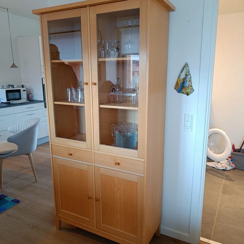 Vitrineskab i burned eg, massiv træ