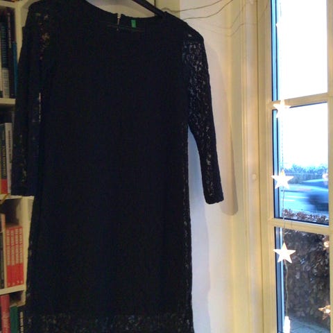 Benetton kjole i størrelse M. Med flot grafisk mønster i farverne blå, sort og råhvid. Med krave ved halsen.