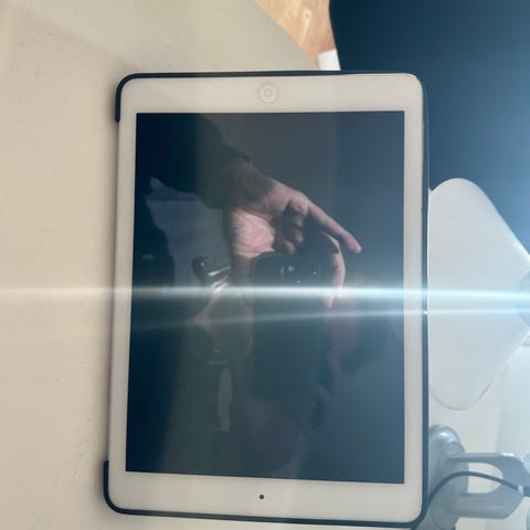 Vær OBS på følgende to ting. Det ene er at iPad'en har en flænge i glasset. Nogle gange kan det ses, andre gange lægger man ikke så meget mærke til det. Der er lidt oppe i hjørnet, og så en der løber ned gennem noget af skærmen(se billede) som sagt, nogle gange kan det ses. Andre gange synes jeg ikke man lægger så meget mærke til det.
