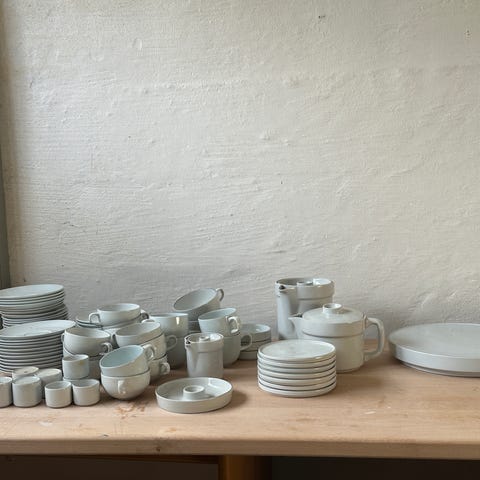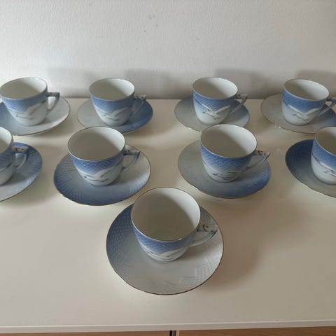 Bing & Grøndahl 15 kaffekopper med få underkopper, 2 tekopper, flødekande og sukkerskål, med underkopper ,sæt i porcelæn. Sættet indeholder flere kopper og tallerkener, alle i hvidt porcelæn med en enkel og klassisk design.