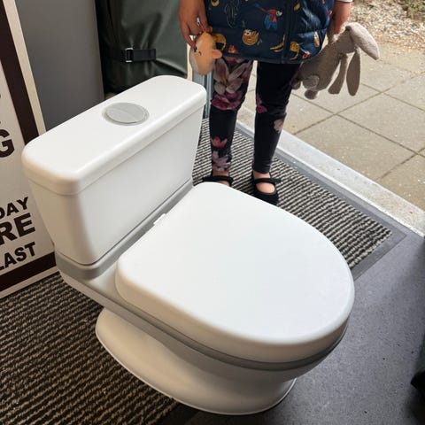 Potte der ligner et minitoilet, med skyld-ud lyd når man trykker på knappen. Selve potten kan tages ud af toilettet og rengøres nemt