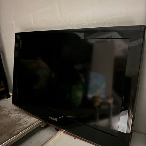 Samsung LE32R71WVXEC TV med fod, skærmstørrelse på 32 tommer. TV'et har en hvid farve og leveres med fjernbetjening. Strømforsyning: 220-240V, 50/60Hz, 19W. Modelnummer: LE32R71WVXEC.