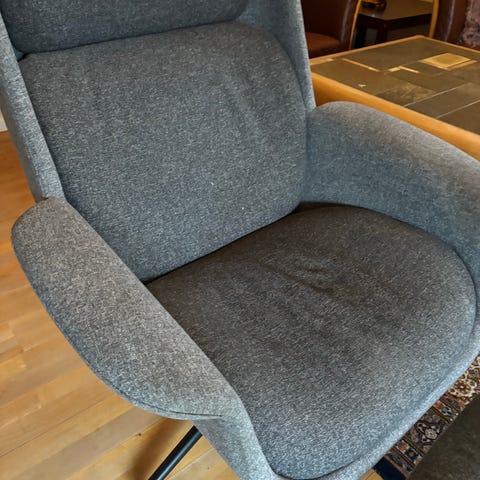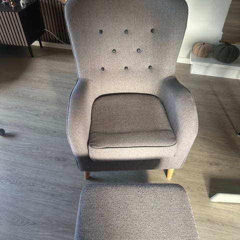 IKEA lænestol med tilhørende skammel i gråt stof. Lænestolen har høj ryg og armlæn, designet til komfort og afslapning. Stoffet er holdbart og velegnet til daglig brug.