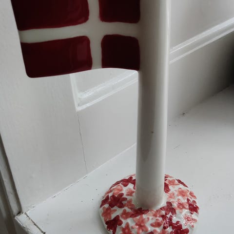 Super fint flag fra Speedtsberg med røde tern på flagstangen. Helt nyt.