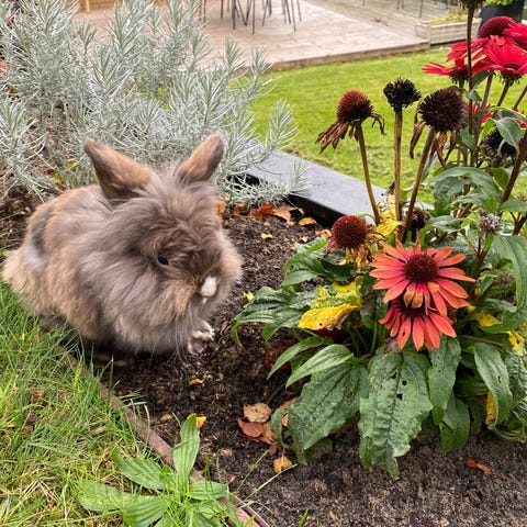 Han er en indendørs kanin men har dog været meget ud før frosten kom.