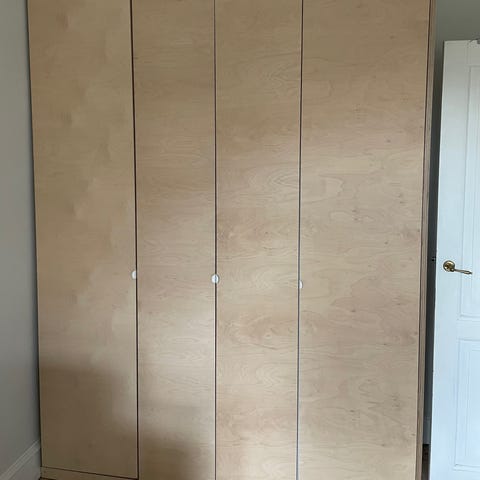 Komponenter til IKEA PAX-skabe (hvid og træ) 4stk 100 x 58 x 236. Der burde være dele til et helt sæt, men uden garanti. Der er brugsspor, og nogle dele er gået i stykker.