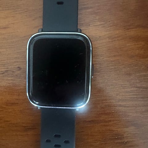 Smartwatch med sort rem og rund skærm. Uret har digital display med forskellige funktioner vist på skærmen, herunder tid, dato og aktivitetsmålinger. Remmen er perforeret for justerbar pasform.