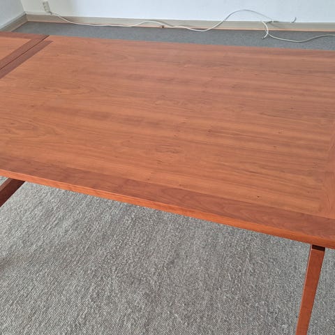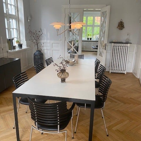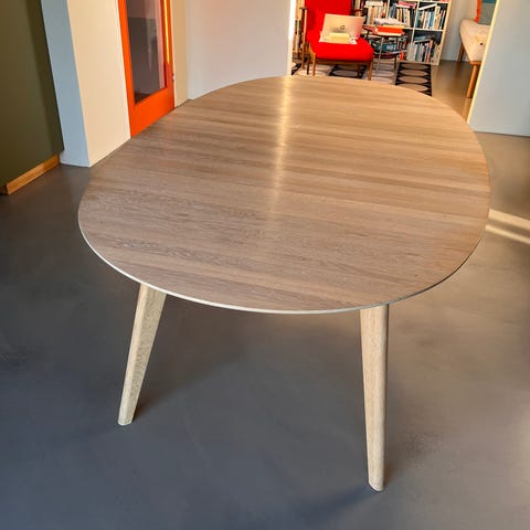 Karstensen-Kristensen spisebord i massivt træ med naturfarvet overflade. Bordpladen består af tre brede planker og måler 160x100 cm. Bordet har en robust sort metalramme som understøttelse, sælges kun fordi jeg skal have lavet om i min stue og ikke har plads