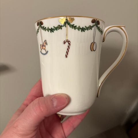 Royal Copenhagen julekopp i porselen, 4 stk. Hver kopp har julemotiv og teksten "god jul". Passer til sesongbasert bruk i julen.