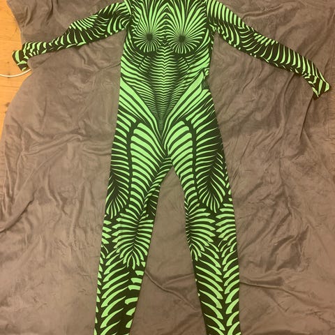 Heldragt til kvinder med holografisk mønster i nuancer af lilla, pink og blå. Materialet fremstår glansfuldt og strækbart, egnet til kostume eller performancebrug, træning eller til de modige til hverdag.