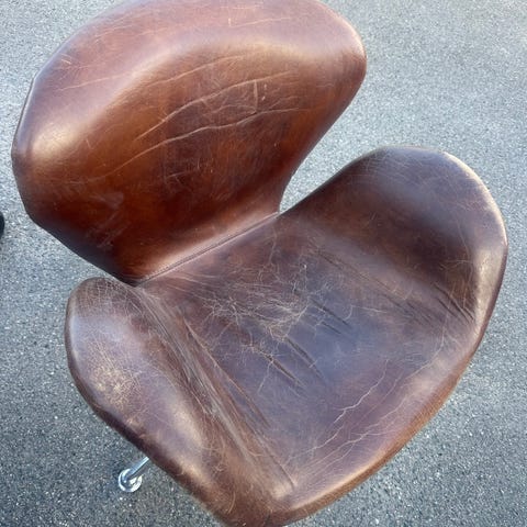 Vintage læderstol med træramme. Stolen har en polstret sæde- og rygdel i brunt læder med en solid træstruktur. Velegnet til brug som komfortabel siddeplads i stue eller kontor.