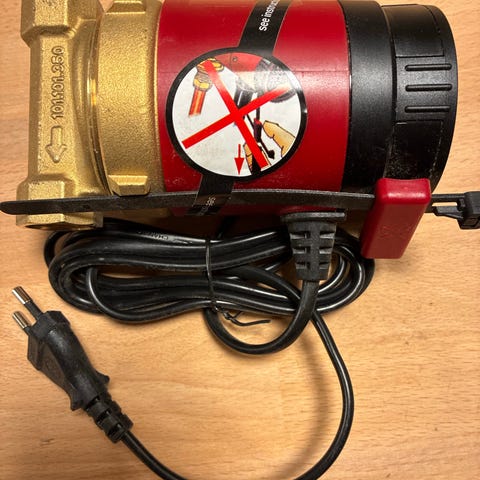 Grundfos UP 15-14B varmevandspumpe med messinghus og sort-rød farve. Pumpen er designet til cirkulation af det varme vand.