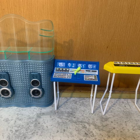 Film og musikstudie med kamera, keyboard, guitarer, håndholdt kamera, mikrofon osv.