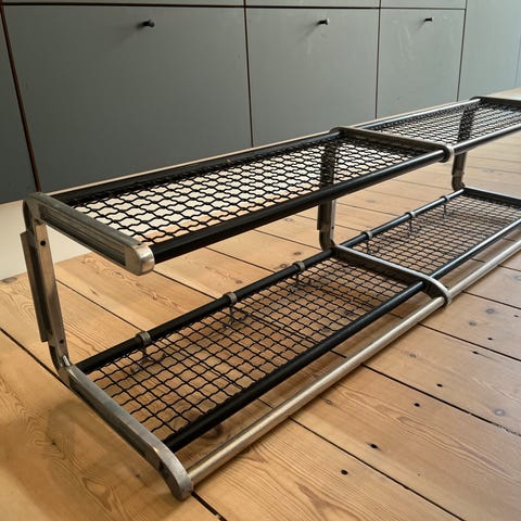 Sælger en klassisk svensk hattehylde af modellen Rio. Hylden minder meget om de kendte designs fra Essem og er i super god stand. Den er udført i en fed kombination af rustfrit stål og aluminium, hvilket giver den et råt og tidløst retro-look. Perfekt til entréen, hvor den både fungerer som praktisk opbevaring og som et stilfuldt designelement.