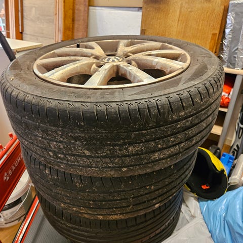 Dæk med fælge i størrelsen 225/45 R18. Sættet består af fire dæk monteret på fælge. Dækkene er mærket med DOT R8F1 og har vægtbalanceringsklodser monteret. Fælgene har et mønster med fem bolthuller og viser tegn på brug.