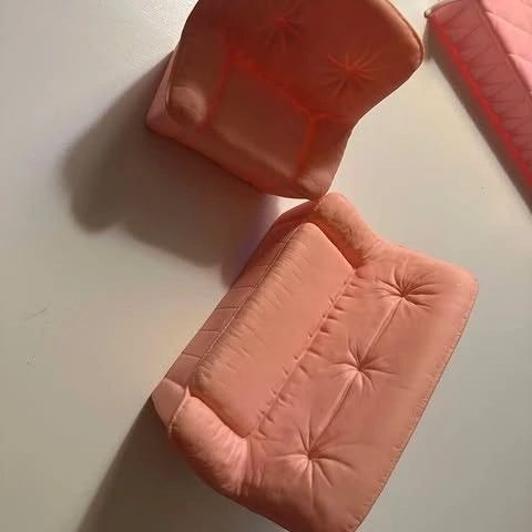 Barbie tilbehør til dukkehus bestående af to blå liggestole, et pink bord og en glitrende delfinfigur. Materiale og størrelse ikke oplyst.