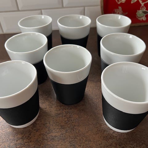 Store hvide tekrus med hank fra Bodum. Måler 10,5 cm i højden og 9 cm i diameter. Rummer ca 3 dl.