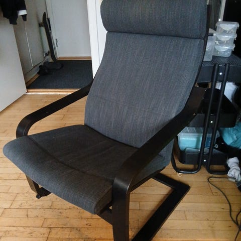 Min mand elsker denne stol. Men vi har ikke plads til den. Man sidder rigtig godt i den. Der er syet nyt betræk. Gammel, men superfin billig lænestol.