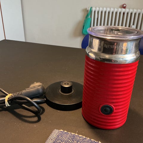 Nespresso Mælkeskummer elektrisk med sort og rustfrit stål ydre. Designet til at skumme mælk til kaffedrikke. Udstyret med en aftagelig låg og elektrisk tilslutning via ledning.
