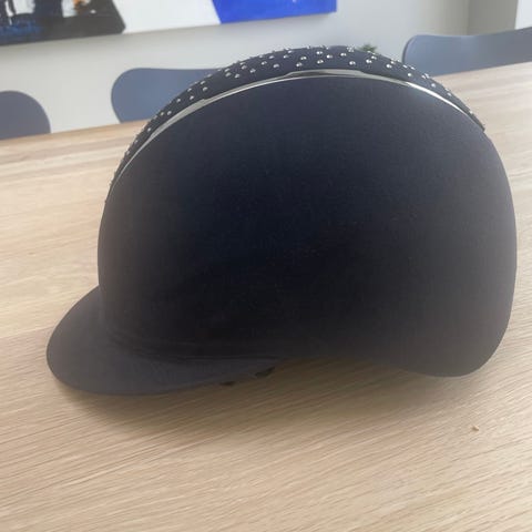 Virkelig flot ridehjelm fra Horze. I mørkeblå velour med similisten. Den har ingen mærker og ser ud som ny. Har aldrig været i et fald fra hesten. Str. S ( 53-55 )