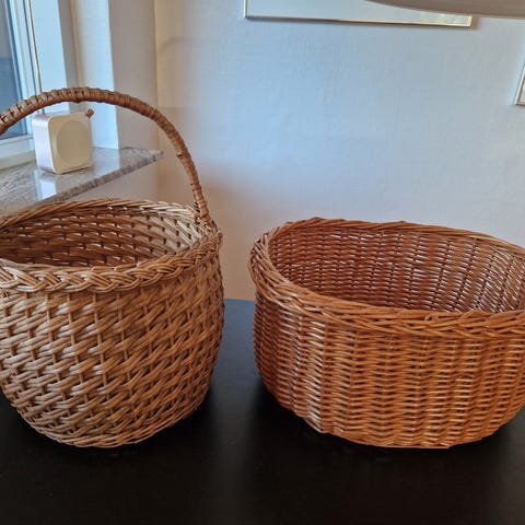 6 flettede kurve, sælges samlet. Den store lilla dia 30cm højde 12cm, den med flettet birkebark dia 19cm, rund med hank dia 18cm, kvadratisk grøn med hank 15x15cm, aflang firkantet 17x12cm, lille lys med høj hank 30cm. Samlet pris 100kr