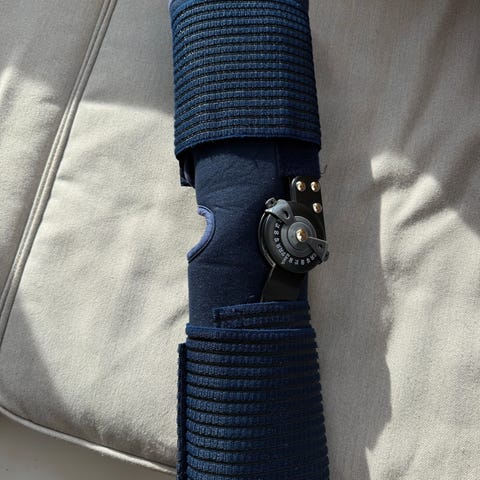 Ortopedisk knæortose med justerbare stropper designet til støtte og stabilisering af knæleddet. Ortesen har polstrede stropper for komfort og metalstænger for ekstra støtte. Anvendes til rehabilitering eller immobilisering af knæet.