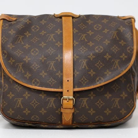 Louis Vuitton Saumur 43 i monogramlærred Canvas og Vachetta-læder.