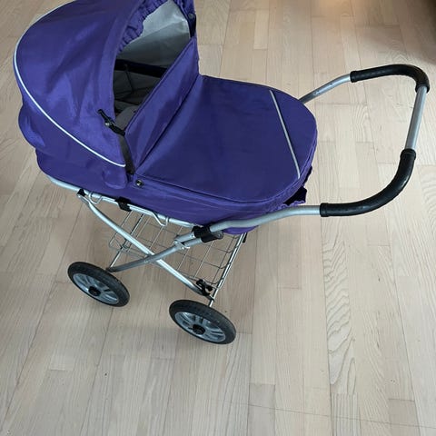 Meget fin dukkevogn. Medfølger overslag og hjemmesyet madras, hovedpude og dyne. Dukkevognen kan klappes sammen. Markisen og håndtaget kan justeres.