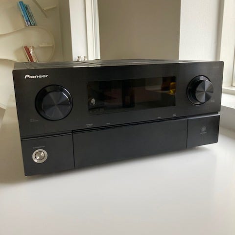 Pioneer AV Receiver SX-203RDS med tilhørende gulvhøjttalere. Receiveren har flere tilslutningsmuligheder og kontrolknapper på forsiden. Gulvhøjttalerne er sorte system audio 930 med tilslutningsterminaler på bagsiden.